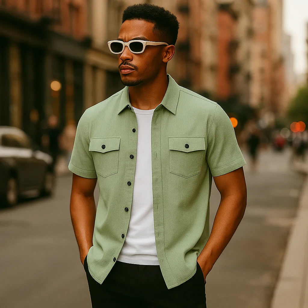 Dieses einfarbige Kurzarmhemd besticht durch sein klares, minimalistisches Design und ist perfekt für warme Tage. Das atmungsaktive Material sorgt für Komfort und Stil – egal, ob Sie am Strand oder in der Stadt unterwegs sind.