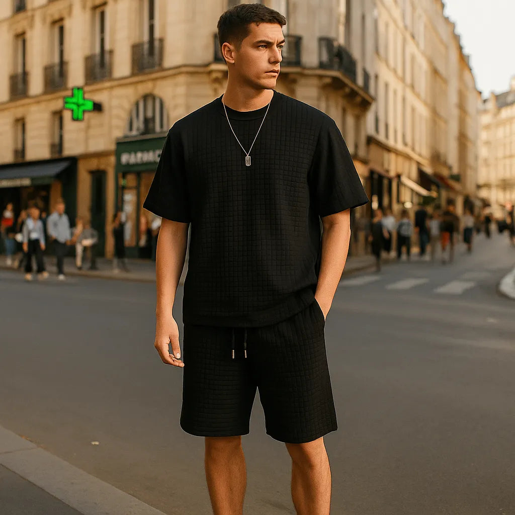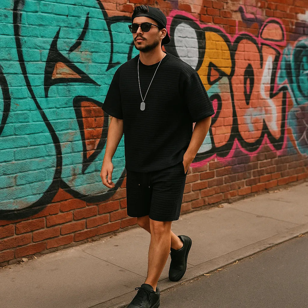 Bleiben Sie cool und stylisch mit diesem atmungsaktiven Waffelstrick-Set, bestehend aus einem kurzärmeligen Oberteil und passenden Shorts. Perfekt zum Entspannen zu Hause oder für einen sonnigen Tag im Freien.