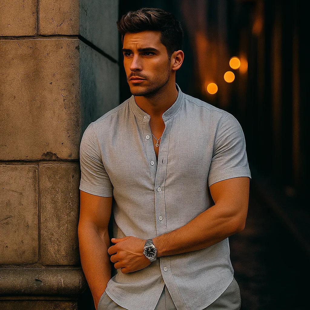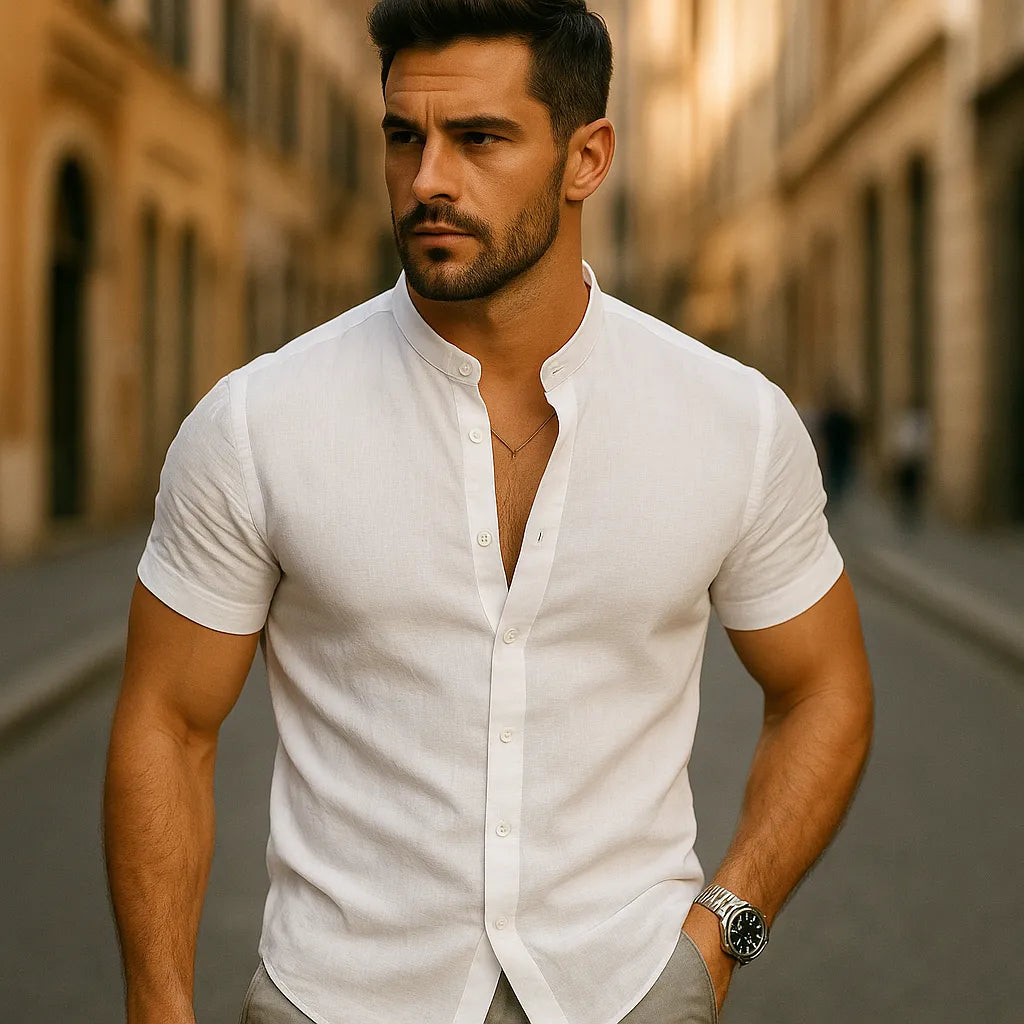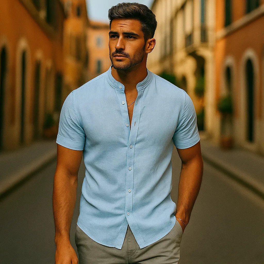 Bleiben Sie cool und selbstbewusst in diesem leichten Hemd aus Leinenmischung mit entspanntem V-Ausschnitt und kurzen Ärmeln. Das atmungsaktive Material und die klare Silhouette machen es zu einer vielseitigen Wahl für Sommertage, egal ob am Strand oder in der Stadt.