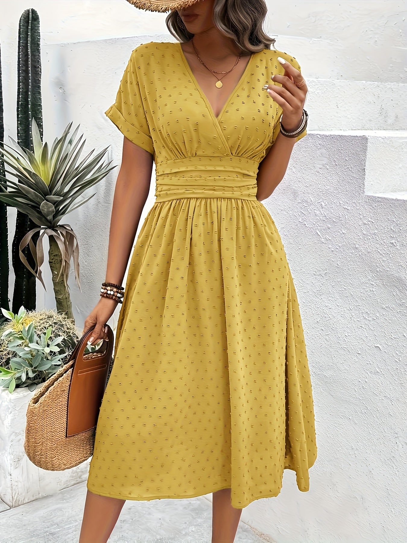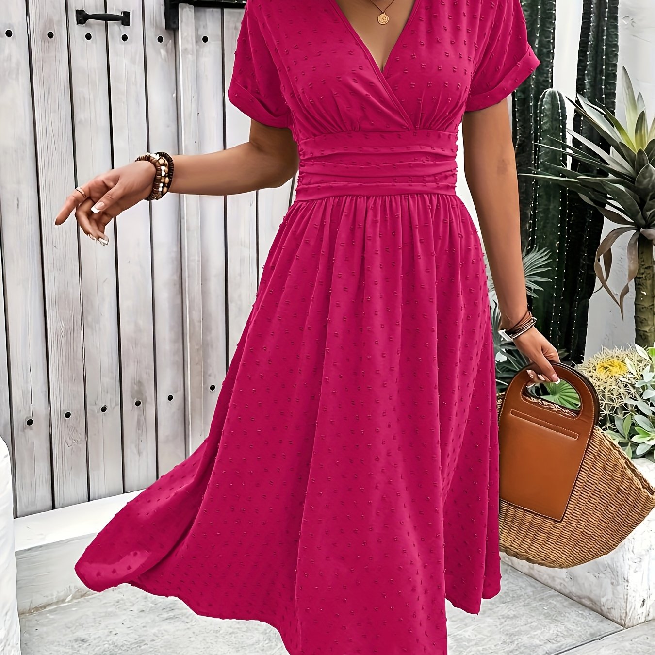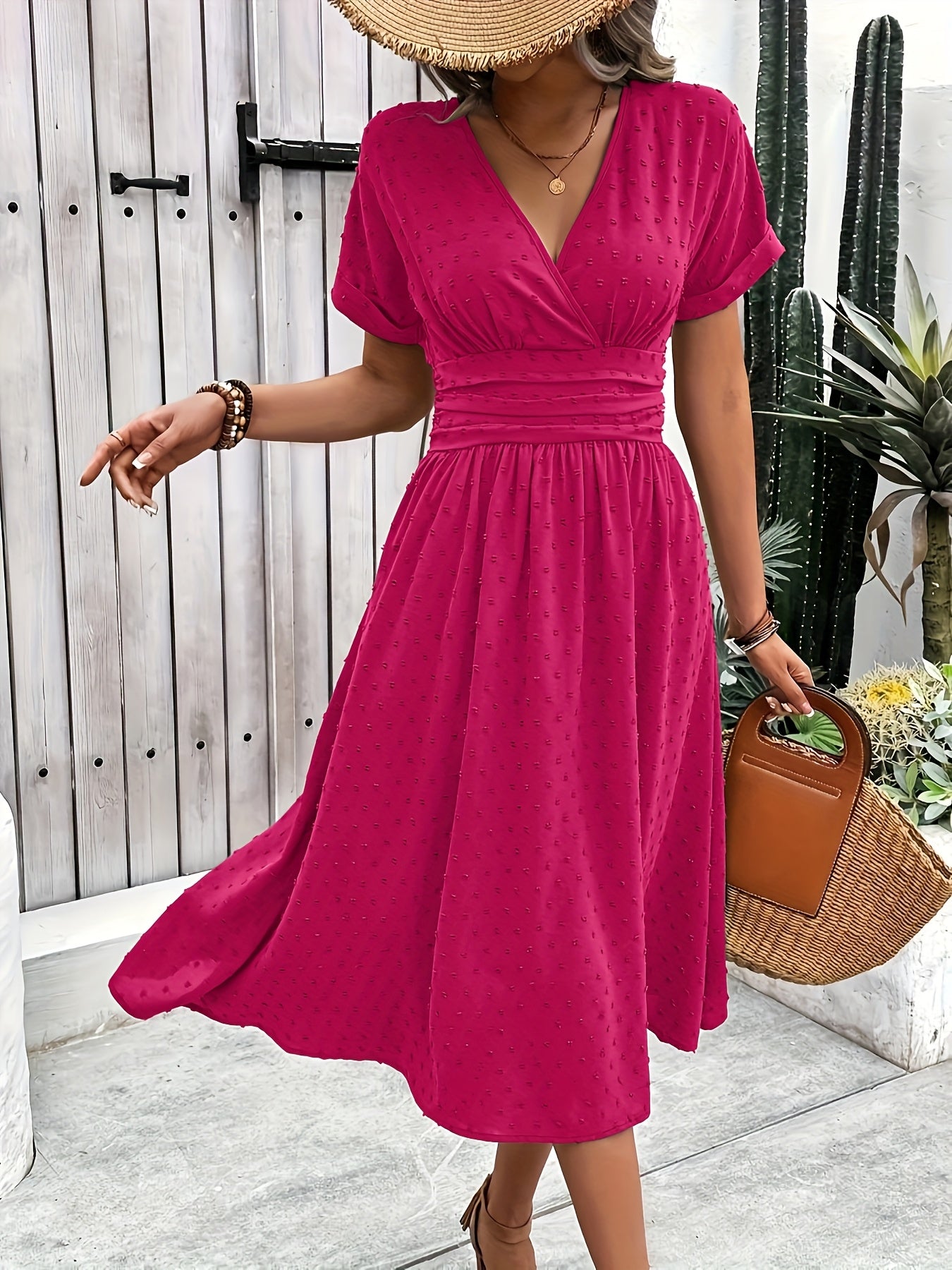 Hergestellt ausleichtes Polyester, es verfügt über eineschmeichelnder V-AusschnittUndA-Linien-Schnittdas Ihre Silhouette betont und gleichzeitig ganztägigen Komfort gewährleistet.